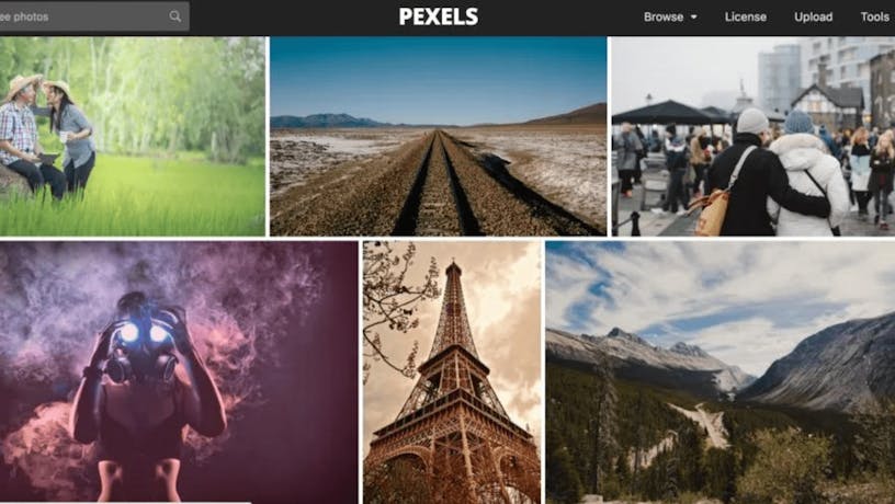 Shots featured on Pexels.com front page: Monochrome wildflowers (center left), and chocolate monochrome Eiffel Tower (center bottom)